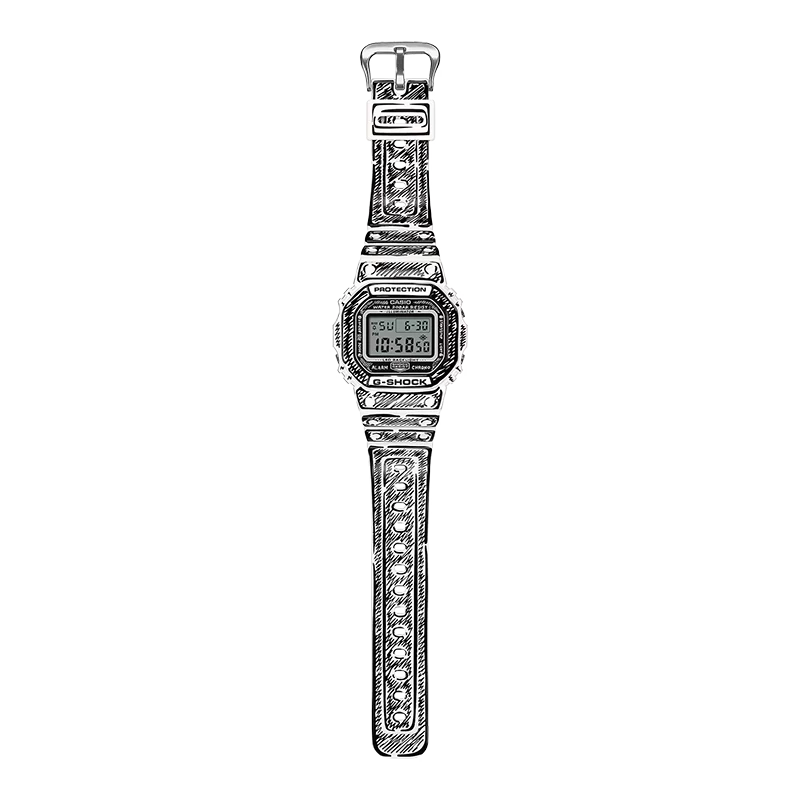 Basen är den ikoniska fyrkantiga DW‑5600, här tolkad genom Joshua Vides karaktäristiska svartvita, handritade estetik. Den vita boetten kontrasteras med svarta, serieteckningsliknande linjer som löper över boett, armband och urtavla och ger ett distinkt “two‑dimensional”-intryck. När bakgrundsbelysningen aktiveras framträder konstnärens välkända “Cone”-motiv en subtil detalj som förstärker känslan av exklusiv specialutgåva. Klockan levereras dessutom i specialdesignad förpackning framtagen för samarbetet.
