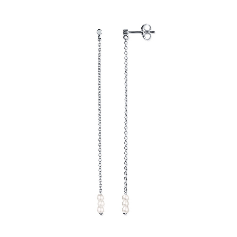 Örhängen i återvunnet silver med sötvattenpärlor på tunn kedja.